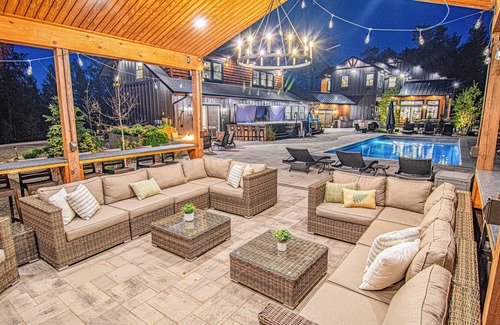 Between the Main Lodge and the Clubhouse sits the amazing 12’x14’ lakeside heated pool. It is surrounded by a massive 5,000SF paver patio featuring a huge outdoor sectional around a gas fire table, an outdoor kitchen with built-in grill and wood-burning pizza oven, dining tables for 50+ people and more. There are also two, 8–10 person hot tubs with seating at a 12’ countertop on either side of the hot tubs, and outdoor TV. ... Not to mention the 20'x20' poolside cabana that has seating for nearly 20, another TV and a beautiful stone fireplace. The cabana and all three of the main buildings are interconnected with a massive 2,000SF web of concrete sidewalks and patios.