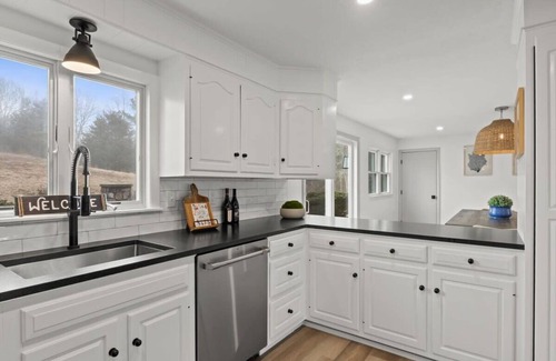 Brand new kitchen with GE Cafe Appliances including a stainless steel flat top stove, microwave, dishwasher and french door refrigerator with ice and water dispenser. Well stocked kitchen with all the necessary cooking/serving items including glasses, mugs, cookware, utensils, plates and bowls, to prepare gourmet meals. Enjoy your morning cup of coffee from the Kurig or a whole pot for the family in the 12 cup drip coffee pot.
