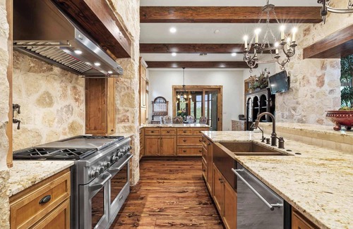 The Rusted Roof Ranch offers a vast 80-acre estate complete with a striking home and pool, providing comfortable accommodations for up to 16 guests. Perfect for family reunions, weddings, and gatherings, the ranch can comfortably seat about 28 people at dining tables. Including outdoor furniture and additional seating areas like the bar and breakfast bar, there's space for approximately 42 guests. Boasting an array of high-end amenities, including two studies, a fitness room, and a well-appointed bar overlooking a game room with a pool table, the ranch ensures endless entertainment possibilities. Relaxation awaits on three large porches, one featuring an outdoor fireplace, perfect for enjoying evenings under the stars. Outdoor enthusiasts will delight in the spectacular outdoor kitchen, equipped with a custom-built Pitts & Spitts smoker, gas grill, and high/low burners. Explore the grounds adorned with a lush oasis of oak trees, offering seclusion while remaining conveniently close to the Hill Country's attractions. From wineries and shopping in Fredericksburg to concerts in Luckenbach and river excursions along the Guadalupe River in Gruene, adventure awaits around every turn. Whether hosting larger group getaways, corporate events, or attending a nearby wedding, the Rusted Roof Ranch promises an unforgettable experience.
