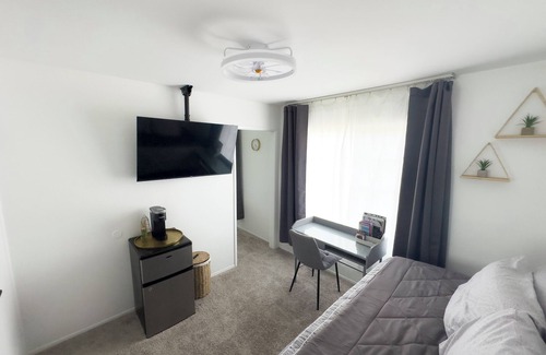 There is a dorm room sized refrigerator for your convenience, as well as 2 TV's with streaming apps. There is a Keurig Coffee Machine and a desk for those who need a space to work. I provide clean and fresh towels, linens, pillows.
