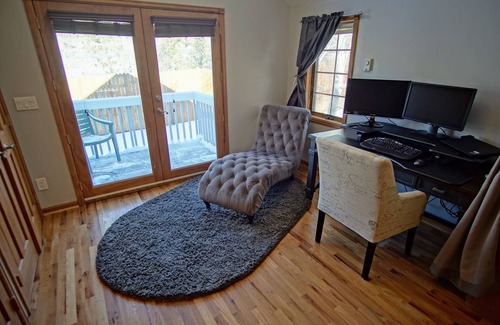 Upstairs is the large master suite which includes a tempur-pedic king size bed and attached full bath. Bring your laptop and enjoying working from the office which includes a desk and monitor and wifi speed of 200 mbps Take a break and enjoy sitting on the office deck.
