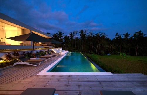 Villa Harta Ubud is a large modern villa consisting of 5 bedrooms, each with a private bathroom. Three of the bedrooms overlook the rice fields and river view, and the other two have lovely garden views. All have king sized beds, 2 of which can be divided into single beds. The villa is perfect for couples or families who want to enjoy the serenity of the Balinese countryside. The location is only 2.6 kms from the northern end of Ubud Main Road .There are many local eateries in the area to try.The pavilion in the lower garden can be used for yoga, massages or just quiet reflection. There is a 19-metre infinity pool overlooking the rice fields. Reverse osmosis filtered water throughout the villa. Full butler service is offered, with Santi and staff available from 7.30am to 8pm to prepare you a delicious complimentary breakfast and assist you with all your needs, including transport, tours and massages. Lunch and dinner are available on request for a small fee. Padel courts within 300m.