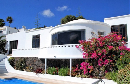 This beautiful villa is situated just 1 km from the historic town of Teguise. The villa boasts spectacular sea views over Costa Teguise, Arrecife and even as far as Feurteventura. The villa has a good sized heated swimming pool, feature circular living room, 3 bedrooms, 2 bathrooms, open plan split level living space, modern kitchen and large games room with table tennis table. Just 15 minutes drive from beaches.
