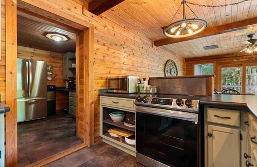 Unwind in the private hot tub or gather around the cozy fire pit, sharing laughter and stories. Just steps from your door, adventure awaits with kayaks for exploring the tranquil lake and fishing gear for a peaceful day by the water.