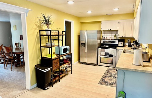 Relax at our very private hideaway in the Seabeck woods. Enjoy the covered patio w/hot tub, light a campfire, explore the property, play shuffleboard or air hockey. Great location, 10 min to freeway and Silverdale shopping (Costco etc). Less than 5 min to Hood Canal/Big Beef Creek, popular with wildlife photographers and Northern Lights chasers. Near Scenic Beach Park, historic Seabeck. Renters have house and property to themself.High speed wi-fi and fenced yard. Contact host for monthly rates Whether you're exploring the city or simply enjoying the tranquil surroundings, we hope you enjoy what our place and Bremerton has to offer.