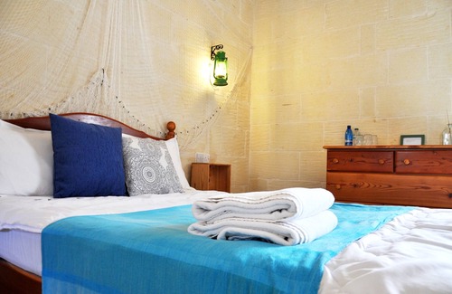 A spacious and bright room in a B&B with an en-suite bathroom, set on the ground floor of an ancient farmhouse. Access to the pool and a living area where to chill and read and where to enjoy the breakfast. There's also a coffee and tea station available 24h and a refrigerator for common use available. Nearby there are many wild paths to the cliffs of Gozo where to enjoy the view of a sunset and also it is by walking distance from shops and restaurants. The bus stop is in front of the house and the parking is allowed just in front of it.