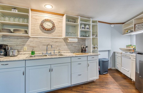 Relax in our three living room areas. Enjoy preparing a wonderful meal in our well-equipped kitchens (that's right, there are two kitchens) or on the charcoal grill or take full advantage of the many dining options in Bryson City and surrounding towns. Take in the outdoor sights and sounds from our front porch dining table, covered patio, or backyard firepit. The majority of the indoor decor and furniture were crafted by talented local artisans. The three full bathrooms are en suites in three of the five bedrooms- one on the first level, one of the second level, one on the third level of the house. The half bath is located off the main living room and kitchen. If part of your group needs a little space all to themselves they can enjoy the apartment suite with a living room, full kitchen, dining room, and bedroom with an en suite bathroom.