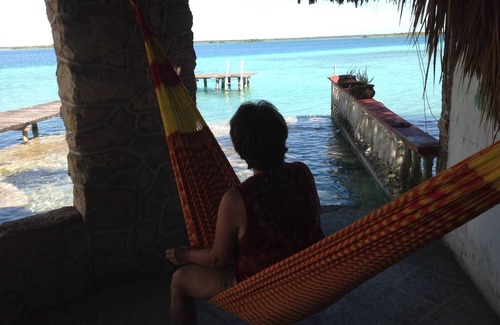 Quinta Mai is a colorful slice of tropical paradise on the southwest shore of Laguna Bacalar in the town of Bacalar. It is perfectly located on the tip of a small peninsula that separates two deep blue cenotes. Because of the crystal clear water, the white sand bottom, the intense sunlight, and the variable depths of water, an incredible play of colors is before your eyes. The locals call it 'The lake of the seven colors' and you can see all seven colors, and more, from the dock at Quinta Mai. It is also excellent water for swimming. Some of the properties on Bacalar have muddy shorelines and other properties have a very steep approach to the water. Others are too low and they tend to get muddy. Quinta Mai is perfect. It's moderately elevated above the waterline so it's easy to get to the lake. The Lake bottom around the shoreline is firm sand and so the water remains clear. Furthermore there are living rocks called stromatolites just off the shoreline which are concretions a blue-green algae and extremely rare throughout the world. At the end of the dock the water is about 5 feet deep and so you can easily dive into the water. The snorkeling on the lake is beautiful because the water is so clear and there are large rocky ledges and drop offs to explore. If you swim out about 60 yards from the dock you will reach the beginning of a deep blue cenote where the water depth drops rapidly down to about 125 feet. Swimming in the other direction the water becomes quite shallow and it gets down to about 2 feet. This creates a play of colors that varies with the time of the day, the wave action and the cloud cover. Sitting on the dock under an umbrella and looking at the clouds and the colorful lake is absolutely mesmerizing!