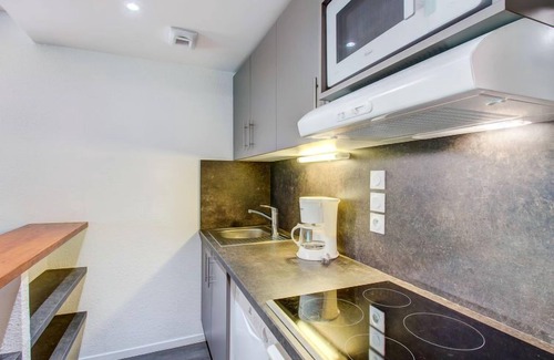 "Privilège/ Studio cabine 4 pers.", 2-room apartment 25 m2. Practical furnishings: living/sleeping room with 2 sofabeds and TV. Alcove with 1 x 2 bunk beds. Kitchenette (dishwasher, 2 ceramic glass hob hotplates, microwave). Shower/WC. Electric heating. Balcony. Facilities: Internet (WiFi, extra). Maximum 1 pet/ dog allowed. Instead of an enclosed bedroom, some sleeping areas are located in an open-plan area (gallery, alcove, etc.).