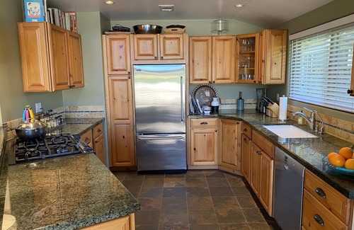 Lower nightly rate Jan only, plus enjoy a 5% discount for booking 28 nights or more, saving hundreds. You’ll love my place because of the high ceilings, the single level, the mountain views from the private outdoor patio with gas grill. In coveted San Roque/Mission Creek area. This condo is perfect for couples and solo visitors. Guests are sure to enjoy a memorable extended stay in this fully furnished 2 bedroom/2 bath condo. The main/master bedroom has a queen-sized bed, while the other room is furnished with a full-size modern pull-out couch. Condo sleeps three, but one couple or a single person is best for this space. The open floor plan living room is furnished with a large sofa in front of a gas fire place and flat screen television. The open counter kitchen is perfect for cooking and entertaining as it is equipped with all appliances and many cooking tools/accessories. Dining table seats four to six. In-condo laundry room. Beautiful condo association swimming pool and lounge deck area. A quiet area near parks and trails, and also easy walk to retail stores and restaurants. Santa Barbara Botanical Gardens just up the hill. Rocky Nook park within walking distance. An easy walk to quaint restaurants, coffee spots and brew pubs. Short walk to bus stop for quick trip to downtown or the beach. Truly an ideal setting. You won't believe the quiet and the starry nights.