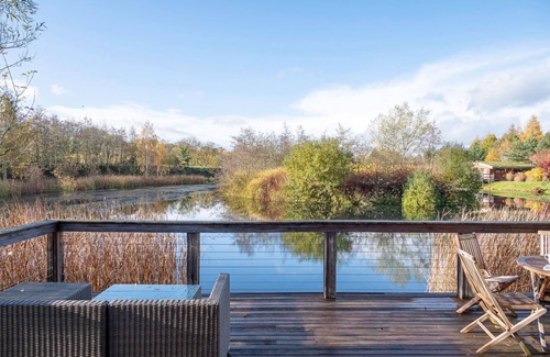This lakeside cabin in Yorkshire at Brompton Lakes has a contemporary and sophisticated design, making it perfect for year-round getaways and special occasions.