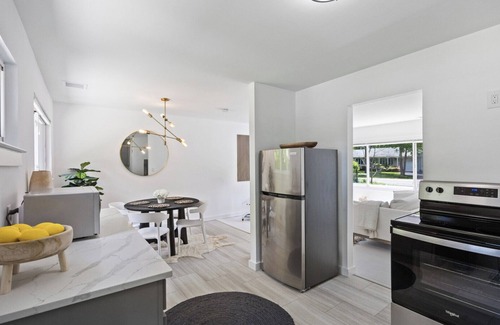 3BR/1BA: private heated pool, recently renovated, brand new kitchen with stainless steel appliances and quartz countertops, expansive yard and full privacy
