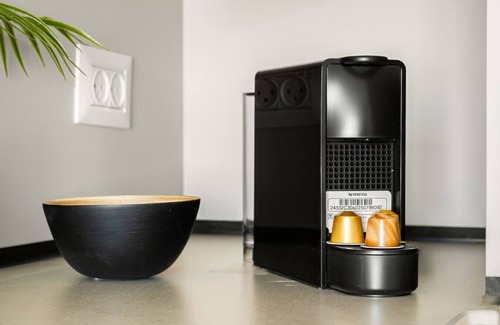 The open-plan kitchen is equipped with a microwave, oven, stove, toaster, Nespresso machine, and fridge—ideal for everything from a quick breakfast to a home-cooked dinner.