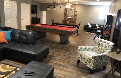 Beautifully designed and decorated: Sleeps 9 with 3 queen beds (master bedroom/bathroom suite & bedrooms w/ detached bathrooms), a twin bunk bed, and stand-alone twin bed. There are: 3 sofas, 1 arm chair, 1 sectional, full game room with arcade video games & pool table, kitchens - upstairs and downstairs, 3 full baths, 2 decks (lakefront), dock, open floor plan (kitchen, dining and living rooms), 3 smart TVs, fully stocked cookware, charcoal & gas BBQ grills, water toys, 3 kayaks, lots of storage room, and spacious living quarters! Free wifi! Beautiful sunrises and sunsets!