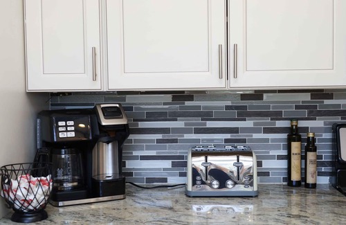 The fully-equipped, designer kitchen has pastel gray wood cabinets, ample storage space, granite counters, and a sleek tile backsplash with hues of gray, white, silver and black. Stainless steel appliances include an electric range, oven, microwave, dishwasher, huge farm-house style sink with pull-down spring faucet and a French door fridge/freezer with icemaker.