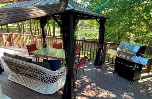 There is a large wrap around deck which includes a gazebo with mosquito netting and a gas grill to make dinner. Relax and take in the tranquil scenery on the large wooden swing or one of the hammocks overlooking the lake. End your day by having a fire in the backyard firepit. Make s’mores and tell campfire stories! *Firewood is NOT provided.*