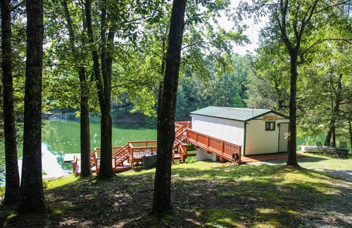 Our Ragin' Cajun Cabin is the perfect spot for a relaxing, outdoorsy stay! Whether you like glamping or tiny homes or fishing or romancing or just "hangin' out", this is going to be your favorite place. This cozy cabin is a one-bedroom, one-bathroom, den with sleeper sofa, climate-controlled home. You can get away from it all here! There are three levels of decking down to the water, where you can swim or fish or lay in the sun. The back deck has a charcoal grill; the front yard has a fire pit with wood supplied. A fast-moving creek is near and you can hike all of our 35 acres. You will see lots of wildlife to add to your adventure.