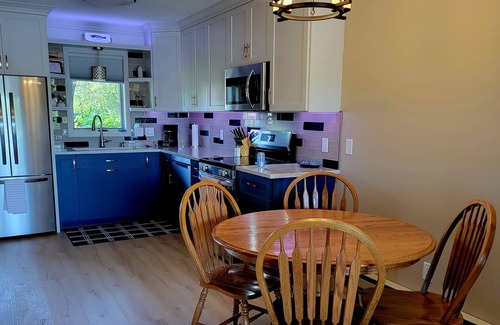 Two bedrooms, 1.5 bathrooms, full kitchen, washer and dryer, gas fireplace. Both bedrooms are on the second floor; the stairs up to the second floor are not steep but please be aware of this. Our couch is a full-sized pullout bed.