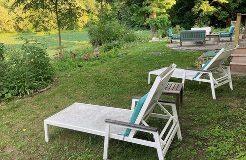 Your home away from home is a charming 1 bedroom duplex apartment, thoughtfully constructed in the 1940’s as a separate wing to The Kellogg Farmhouse. Recently renovated it offers all the amenities required for a comfortable and memorable stay. You can still find local Sheffield marble around the property which was also used to build the Washington Memorial. This modern oasis within a historic setting seamlessly combines the past with the present. Tons of light filters through the large windows that face the gardens that look out into a large field with gardens. There are plenty of areas to enjoy the outdoors and you are a short walk away from the Historic Appalachian Trail. There are two main entrances to the house; if you are facing the property, your entryway is the door to the left with a stone walkway leading you from the parking area straight into the house (please look at the pictures provided). Your unit is located on the first floor of the house. You have an outdoor patio area overlooking beautiful gardens, and a lovely field with a row of 150-year-old willow trees that line the Housatonic River. During winter months, we ask our guests to use the main entrance as an exit, as the stairs in the back can get slippery.
