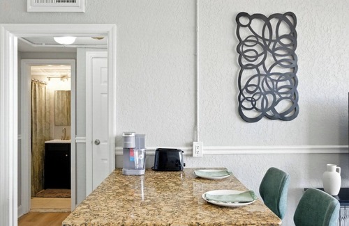 Wake up to sweeping skyline views in this renovated 16th-floor 1BR in Downtown Jacksonville. Relax in a king bed with blackout curtains, stream on smart TV with fast Wi-Fi, or work from a desk. Boutique-style space, quiet yet central, with an equipped kitchen for home cooking. Enjoy secure entry, gym, laundry lounge & clubroom. Steps to Riverwalk, MOCA & Florida Theatre, quick rideshare to EverBank Stadium. Free street parking nights & weekends. Perfect for business, concerts or a stylish escape.