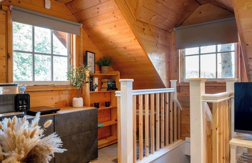 The lodge’s sophisticated yet quirky design blends natural textures with modern elegance, creating a cosy yet refined atmosphere. The open-plan loft includes a smart TV and windows that fill the space with warm natural light, effortlessly framing the scenery and inviting the outdoors in.