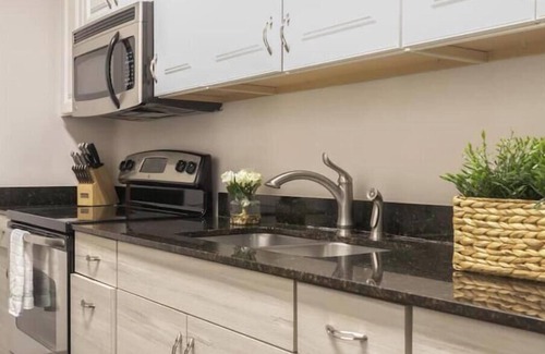 The apartment has 3 bedrooms, each with a Queen bed and soft, white linens for a restful night's sleep. Two bedrooms include private en‑suite bathrooms, while a third full bathroom off the hallway adds extra convenience. You'll also enjoy private parking for up to 2 cars.