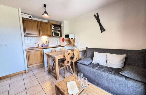 Accommodation: BRUNEL apartment. Warm 26m² apartment for four to six people on the first floor of the residence. Its west-facing balcony offers you superb views of Mont Charvin and the valley. In addition, it is at the foot of the ski slopes and hiking trails! Description : - Living room with television and open kitchen: four ceramic hobs, refrigerator, microwave, dishwasher, mini-oven. - Sleeps: a bedroom with 2 twin beds (2x90), mountain corner with bunk beds (2x90), living room with a double sofa bed (140). Bedding equipped with duvets. - Bathroom with bathtub. - Separate toilets. * Ski locker. * Private parking space. * Pets not accepted. * Non-smoking rental. OUR OPINION: Very beautiful view. Ideal location. Practical for your vacation with family or friends. Additional services: - End of stay cleaning service: CATEGORY C (on request and subject to availability), - Linen rental, - Reservation with reduction of your ski passes, - Loan of baby cot and high chair, stroller rental (on request and subject to availability).