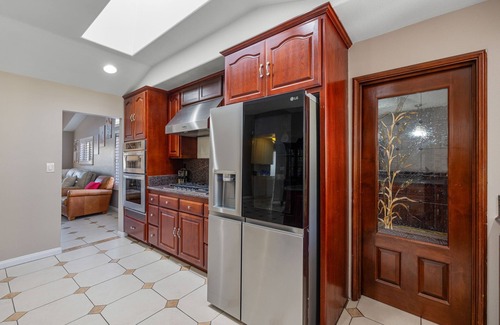 Welcome to your spacious SoCal escape! This 5-bedroom, 2.5-bath retreat comfortably sleeps 13 guests and is designed with families and groups in mind. Inside, enjoy a cozy living room with vaulted ceilings, a fully equipped kitchen, fast WiFi, and a dedicated workspace—ideal for remote work or extended stays. Outside, the fun continues in your private backyard oasis with a pool, hot tub, BBQ grill, firepit, outdoor TV, and multiple shaded lounge areas.