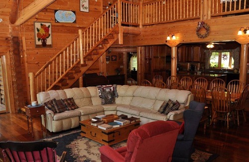 4,400 square foot Log Lodge sitting right on the Tennessee River in Kingston TN. which can be seen on a film tour. Full office suite with computer, wi-fi, fax. copier, internet access running Windows 7. Two completely handicapped equipped master suites. Four TVs with recording capability as well as net-flix. Relaxing ambiance with regulation pool table, ping pong and fireplace gas fired. Fully equipped kitchen. Catering available from a local fine restaurant. Nation wide telephone service. All beds are either queen or King except for 4 bunk beds for the kids. Video tour available on the internet. Bring your fishing gear for great fishing of Bass, catfish and strippers.