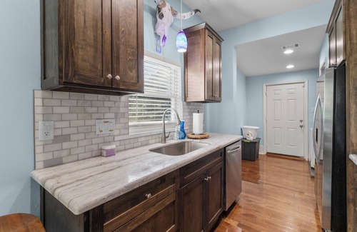 Renovated inside and out. Very modern finishes, 2 block walk to the beach and Pleasure Pier. Perfect for families. Great Neighborhood, easy walking distance to park, skate park, splash pad, beach, and many restaurants. You will love this place! 2 bedroom 2 bathroom Home. Quiet Neighborhood walking distance to many family friendly activities. You can drive to Schlitterbahn and Moody Gardens in about 10 minutes. You can drive to the Strand in about 3 minutes. You can walk to the beach in about 2 minutes without children and about 6 minutes with children. You can walk to the park in about 3 minutes as well with tennis courts, skate park, splash pad and playground.