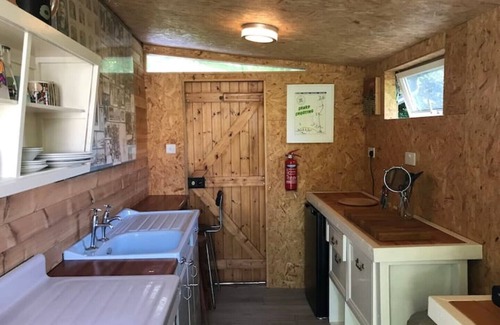 The purpose build communal cooking and washing up area boasts a dual sink, fridge, gas and electric hobs. Space is shared with one additional outdoor experience we offer at the farm.