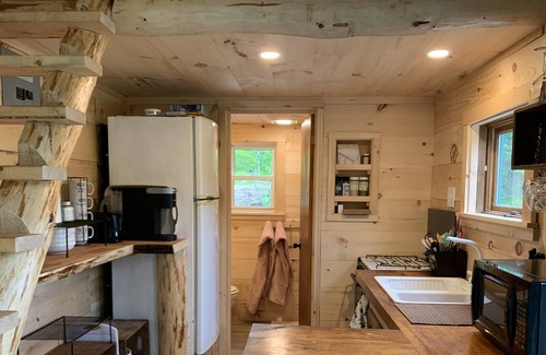 In the heart of the White Mountains sits this brand new tiny house, a nice combo of locally sourced and repurposed materials. It has everything you need for your stay, long or short. Nice kitchen, A/C, keurig coffee machine, 3/4 bath, fluffy towels and pillows. Fantastic views are enjoyed from kitchen, desk, couch and outside. Sleeping loft w. queen size bed. Fire pit, picnic table, grill, hammock and romantic sunsets. Close to Rumney Rocks, Plymouth. A perfect place to unwind and relax.