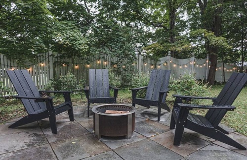 The garden - the property is just over one acre - is private and soothing, with a fire pit, patio, and adorable exterior lighting.