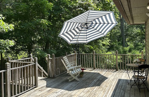 Perfect location for couples looking to getaway. Relax in the large whirlpool bath for two or enjoy your spectacular views of forest and meadow from your wrap around private sun deck. The guest house is situated on the second story with southern exposure allowing complete sun all day, with sky lights for a birds eye view. This guest house is completely private ,shared with no one below. We have A/C, a new Samsung Smart flat screen TV, king sized sleigh bed with the Serta Euro top firm mattress ,hard wood floors through out the guest house,, gas stove, new microwave and a new Cuisinart coffee maker.We are walking distance to the Dinsmore Golf Course and The Mills Mansion on the famous Hudson River. Two miles from the Norrie Point Marina. Five miles from the heart of Historic Rhinebeck Village. Restaurants, Old Rhinebeck Aerodrome, FDR Estate, Vanderbilt Estate, Omega Institute, Rhinecliff and Poughkeepsie train stations ,and so much more are all within your reach.