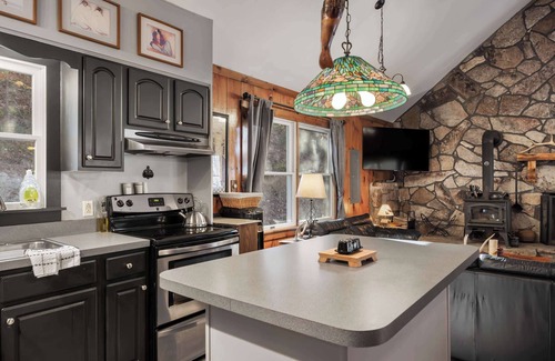 Stone Cabin Hideout is designed for relaxation and comfort. The 2 story open-concept living area is filled with natural light, a cozy stone fireplace - perfect for chilly mountain nights, a loft above, and dining area with ample seating for everyone to gather and relax. A fully equipped kitchen with modern appliances and plenty of space for cooking meals together. Outside you’ll find a large deck spanning the length of the cabin - great for relaxing with a glass of wine, enjoying yard activities or taking in the views. The loft balcony is a great spot to enjoy your morning coffee