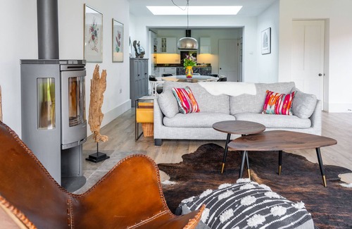 Arriving through the side door, you are welcomed into the luxurious open plan living space with the kitchen, dining area and sitting room. This fabulous room is flooded with light with bifold doors overlooking the rear garden. The beautiful well equipped kitchen has a central island unit and plenty of space for cooking and chatting. There is a dining table and eight chairs in the centre and the sitting room at the far end has a wood burning stove, comfortable sofas and chairs and a spectacular view of the garden and fields, which can be completely opened out during the warmer summer months. The garden leads down to the river at the bottom and fields beyond.