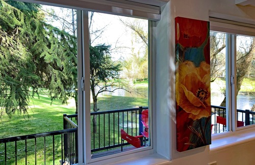 Enjoy one of Spokane's most Beautiful Panoramic Settings. One (1) acre of land. Surrounded by a forest of old growth Pine trees. RIGHT ON The Little Spokane RIVER. You are renting only this Guest House. It is detached and separated from the Main Log cabin (see photos).