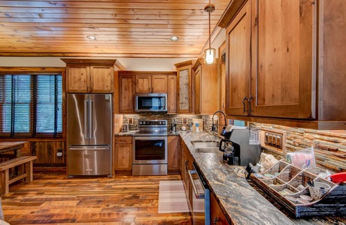 Downstairs you will find a kitchen stocked with basic cooking supplies, living room with a gas fireplace, a utility room with a washer and a dryer, and a powder room. This luxury cabin also includes high quality linens and towels, custom decor, stainless steel appliances, custom cabinetry, granite counter-tops, WiFi, and flat screen televisions with streaming services in the living room and all sleeping quarters.