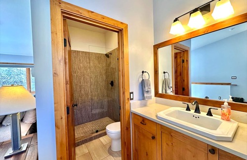 On the second floor is the kitchen with all of the essentials and the living room that features a large flat screen Roku TV (please use your own log in) and new plush couch gathered around a gas fireplace. The kitchen is well quipped with a toaster oven, drip coffee make, wine ware, and more. There is also a half bathroom on this floor. A washer and dryer are available for those wet ski clothes. Step outside onto the outdoor patio and enjoy the crisp mountain air.