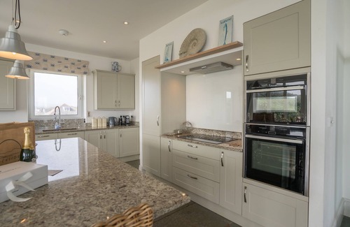 A very sociable, open-plan sitting/kitchen/dining area, with bay windows looking out over the sea and headland. The extensive and very well-equipped kitchen with seating at a large island, leads on to two spacious seating areas both with terrific views.