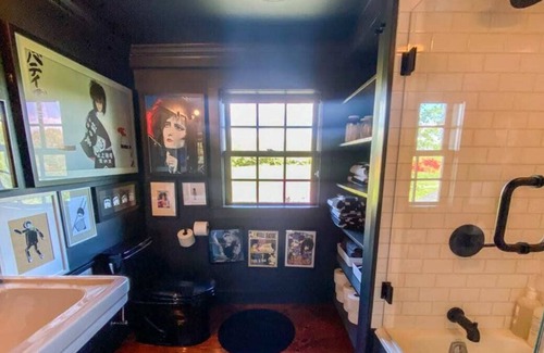 The Great Room, which has double high ceilings and a two-sided wood burning fireplace, velvet sofas, a collection of graphic works by the artists James Victore (featured in the MoMa), a wet bar, Arne Jacobsen cocktails sets, a collection of art inspired by the American flag, George Nelson lamps, and black glass coffee tables. 14 people can easily pile in and watch the sun set drinking cocktails. The Music Room is painted bright red and has a Herman Miller sofa, two red heart Verner Panton Chairs, and colorful accents. A Vitsoe desk with a Saarinen chair, makes it a great office too. There's a record player, and a collection of vintage music posters. Also in the room is the original host chair of RuPaul's first television show, reupholstered in Alexander Girard fabric. The Reading room features two Hem lounge chairs and ottomans and a view of the Hudson, a perfect place to read. The half bath is a shrine to Grace Jones, featuring 15 works of art in her likeness. The other side of the Great Room is the Kitchen and Dining Area. The Dining Room has Muuto lamps, a vintage farm table, and 12 black Eames chairs (with 8 others upstairs and in the basement for larger dinner parties), with Vitsoe shelving. The Kitchen is painted jet black with glassware and plates for 24, and every gadget imaginable. The appliances are all Samsung and there is a large fridge, a white and a red wine fridge, an ice machine, an induction cooktop, a convection over, a gas oven and range, two dishwashers, a toaster, microwave, coffee machine, french press, sous vide, juicer, blender, Kitchen Aid mixer, pressure cooker. There's 20 chef knives, All-Clad and Le Creusset cookware. It's a Chef's dream. In the vintage credenza you'll find cloth napkins, cake stands which we fill with local farm stand fruits and veggies, and serving bowls and platters. This is the place for a dinner party!