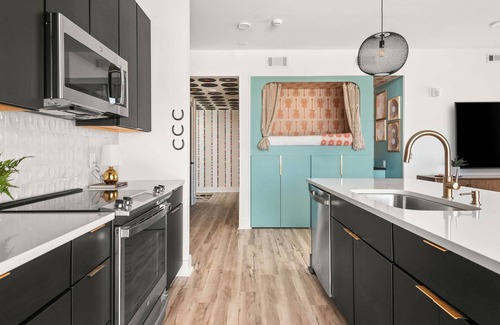 Inside, rich textures, stainless steel appliances, and modern furnishings create an upscale-yet-relaxing vibe. Outside your door, you’ll enjoy access to NEO’s rooftop SkyLounge, weekend happy hours, fire tables, and a fitness center—all just over a mile from Broadway.