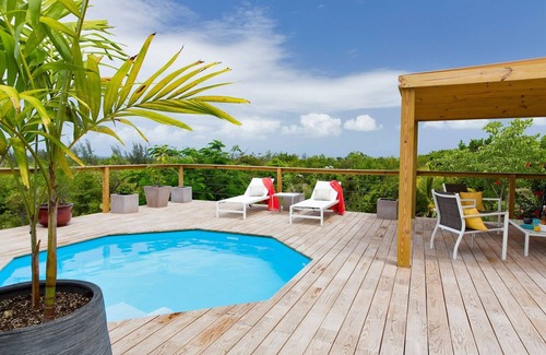 The air conditioned villa features a very large bedroom suite with a king size bed, a tiled shower bathroom, a fully equipped kitchen and a dining room that opens up onto a large deck with a plunge pool and shaded gazebo. There you will enjoy your drinks while watching the sunset over Baie Longue (one of the nicest and listen to the birds in the palm trees and hibiscus flowers.