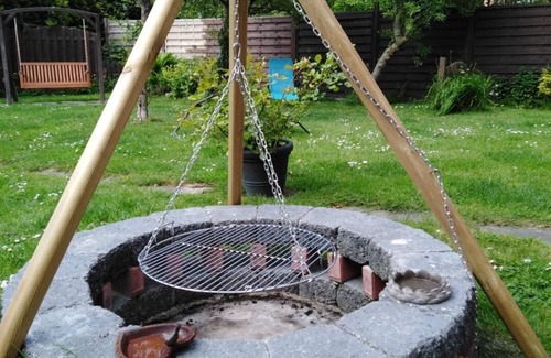 The fenced adjacent garden invites you to relax. There is a large self-built barbecue, sitting areas, sun loungers and a wooden garden swing. Of course, your four-legged friend is welcome and may use the garden to play and romp.