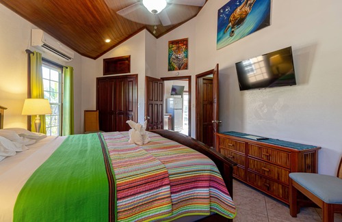 This second-floor, one-bedroom private condo suite offers views of the pool from the shared porch perched above palm trees with glimpses of the ocean beyond. Ideal for couples and small families, there is one master bedroom with a king-size bed, a small en suite bathroom, and a kitchenette complete with a refrigerator, stove, and microwave. One additional child can be accommodated on a rollaway or infant crib.