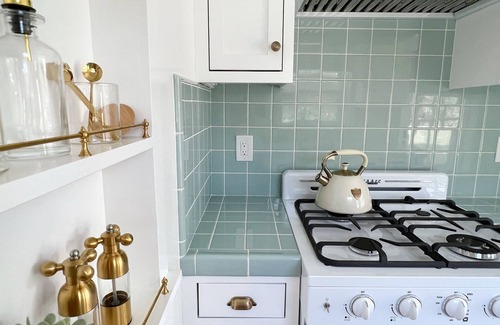 the quaint mint-colored tiled kitchen. Enjoy shopping and all the excellent restaurants Encinitas has to offer. Located just steps from the popular Coast Hwy and a short walk to the