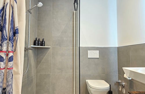 The spacious bathroom has a bright and modern design with a large shower and a washing machine, which you are welcome to use if required. Here you will find everything you need: a hairdryer, towels, shower gel, hair shampoo and conditioner.