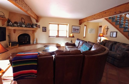 Formerly a bed and breakfast, this lodge-style luxury home features 9 differently themed bedrooms and 8 1/2 baths to accommodate up to 24 guests. A huge, new porch faces the river, complete with grill, picnic tables, and plenty of seating. Up the stairs to the left, find the Train Room (sleep 3 in a queen and daybed) and the Mardi Gras Room (sleep 2 in a queen). Each room has its own bath, TV, and private balcony. Up the stairs to the right find 4 bedrooms, each with a private bath, TV, and shared wrap-around balcony for outstanding mountain views in every direction. The Kachina Room (sleep 2 in a new king bed) has custom artwork (paintings and hand-carved kachinas), a Kokopelli shower curtain, and leather on woven reed handmade barrel chairs. The extra-large Fish Room (sleeps 4 in 2 queens) focuses on making anglers feel right at home with fishing gear, fish lamps, fish shower curtains, and more. Both of these rooms face the river. Across the hall, the extra-large Indian Princess Room (sleep 4 in 2 queens), done in pink and soft teal, features interesting Indian portraits from the princess to her handsome brave to her wise elders and the warrior shower curtain. The 4th bedroom on this side, perfect for a very romantic couple, is known as the "tasteful" Bordello Room--done in rich reds and blacks with gold accents. It sleeps 2 in a new king bed. Downstairs find 3 more bedrooms. The Master Suite, known as the Anasazi Room of the Ancient Ones, sleeps 4 in a new king bed and queen sleeper. The decor features handmade baskets, a commissioned painting by a local artist, and rock art style wall decor. This large elegant room, perfect for those with altitude problems, also includes a small private tiled sun porch with a separate outside entrance and a private bath. Outside this door is a 5x8 dog kennel, an extra convenience in this pet-friendly home. The Wildlife Room (sleep 2 in a queen) focuses on the wide variety of animal life in Red River from elk to bears to ducks to deer. This cozy room shares a Jack & Jill bath with the Cowboy Room next door. Done in reds and blues, the Cowboy Room (sleeps 2 in a queen) will delight the wanna-be cowgirls and cowboys in your family. Boots, saddles, 10-gallon hats, horses, six-shooters, and rodeo art blend together in this rustically charming room. All 3 rooms, complete with TV and wood floors, give way to the saltillo tiled living space on the rest of the main floor. The main front entrance opens into a media room with a full complement of DVDs for both kids and adults. The TV in this room works well for those who have brought their own video games and hook-ups. The secondary front entrance opens into a long narrow laundry room with a new gas dryer, a fairly new washer, and lots of space for hanging skis, raincoats, or hip waders. Winding through the hall, you pass through the mudroom (with a large utility sink) and past the huge double door pantry into the fully stocked spacious kitchen. New stainless steel appliances, a butcher block island, 2 crockpots, a wok, 1 coffee pot, supplied complement of spices, and a new Keurig (bring your own K-cups) plus plenty of cookware ensure lots of tasteful meal opportunities. The dining room, with its 5 tables and lots of chairs, allows for cozy family meals. Be sure to notice the old skis and the many nutcrackers lining this wood-paneled room with a huge log beam ceiling. After dining, sprawl out in the family room in front of the new 56" flat-screen TV or enjoy the wood-burning fireplace. Open the windows to enjoy the refreshingly clean mountain air and the sound of the rushing river as you drift off to sleep in this enormous home with a cozy, intimate feeling, just a few blocks away from the ski lift and Main street. Please see notes for suggestions on what to bring on your Red River Vacation to make your stay more comfortable! If Running Bear is already rented during your preferred dates, check out the other fabulous properties by the same owner: The Villa (sleeps 24) and Birds and Bears Retreat (sleeps 16), located on the river.