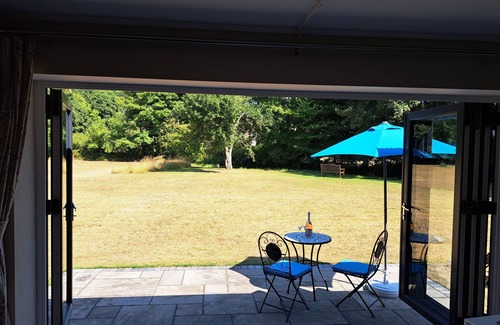 South east facing bi-folds open up to your patio and garden with outdoor furniture for al fresco dining and a bench next to the river to relax away the hours listening to the babbling water.