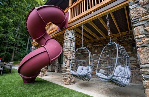 Upper-Level Description: Continuing up the stairs, the upper level of the cabin houses a family suite offering a king-size bed, trundle and crib and the other king bedroom offering a king bed, each sharing a full bathroom. There is a kid's bedroom with 2 twin beds (one of which has a pull-out trundle twin bed as well). There is also a play area, with seating, games, and a slide that takes you back down to the main level!